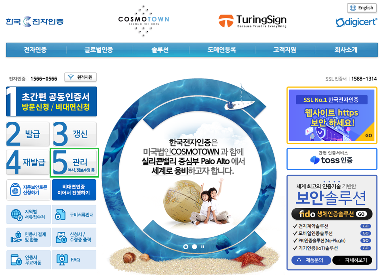 https://www.crosscert.com/ 한국전자인증사이트 접속 > ‘5 관리’ 클릭
