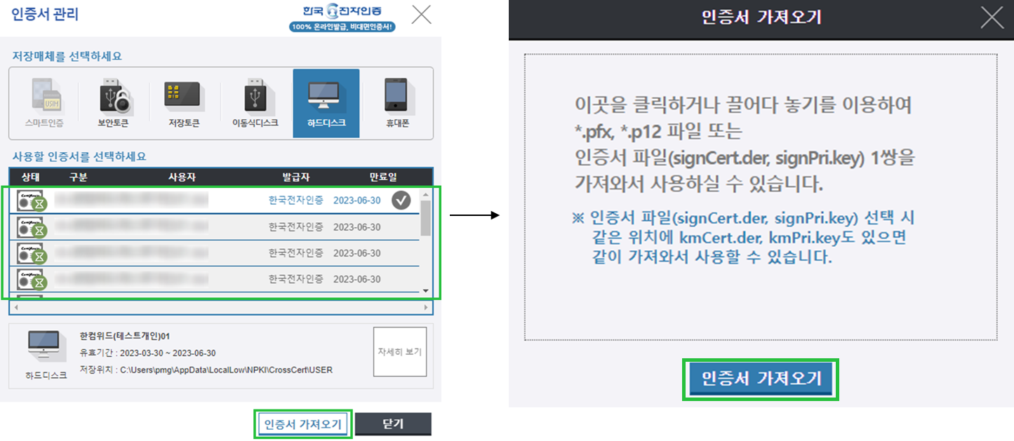 '가져올 인증서 선택 후 '인증서 가져오기' 버튼 클릭 > 인증서 가져오기 팝업 내 '인증서 가져오기' 버튼을 클릭하여 PC에 저장된 인증서를 선택 > 인증서 비밀번호 입력 팝업노출