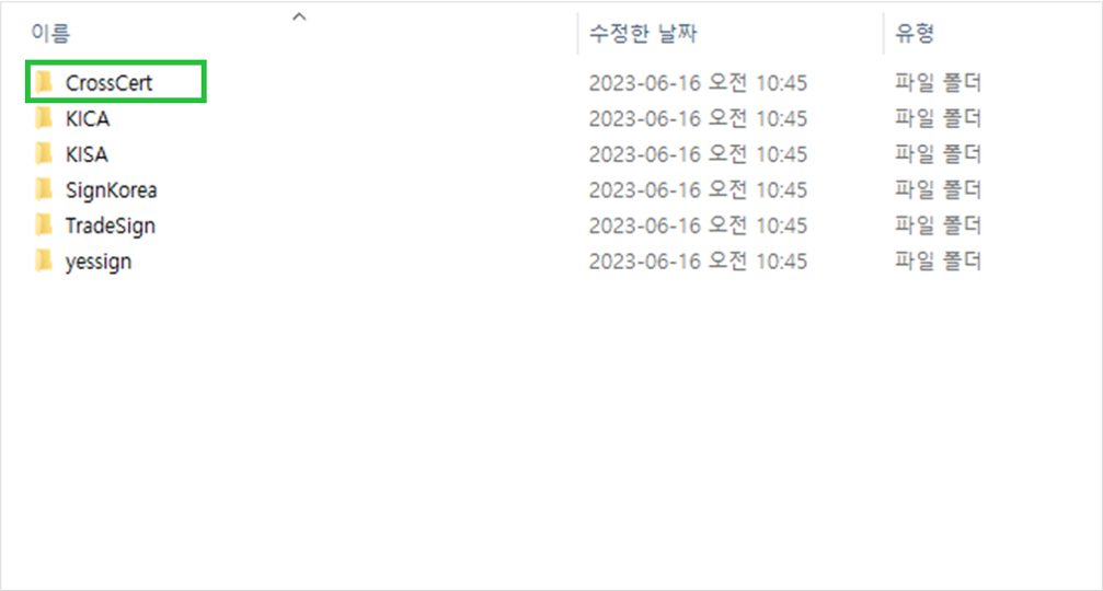 내 PC > 로컬 디스크(C:) > 사용자 > 사용자계정 > AppData > LocalLow > NPKI > CrossCert 폴더 클릭