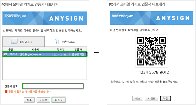 ‘PC에서 모바일 기기로 인증서 내보내기’ 화면의 인증번호 12자리 입력 후 ‘가져오기' 버튼 클릭